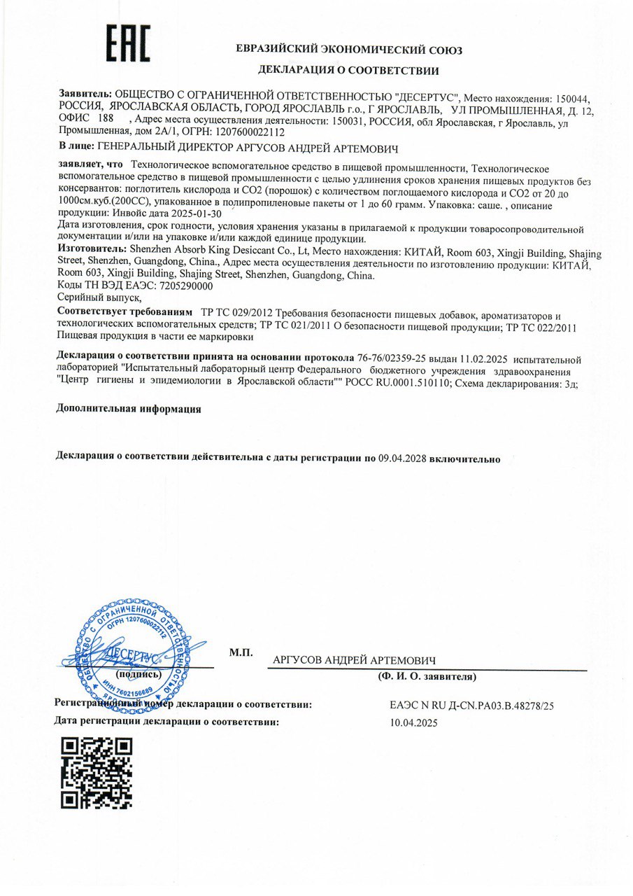 Поглотитель кислорода не просто разово поглощает кислород из упаковки с продуктом. Он активно поддерживает бескислородную среду на протяжении всего срока хранения.